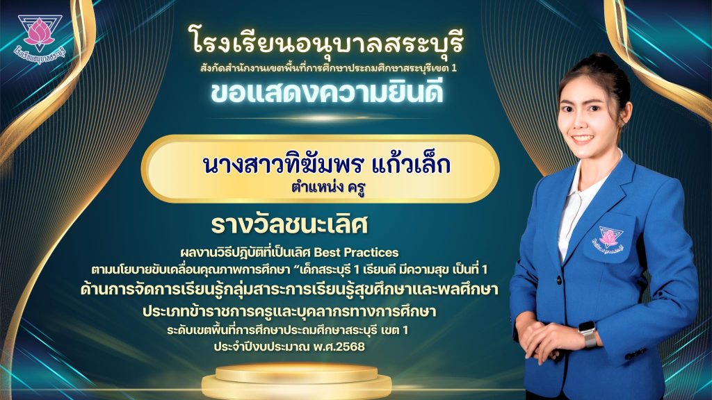 โรงเรียนอนุบาลสระบุรี ขอแสดงความยินดีกับ คุณครูทิฆัมพร แก้วเล็ก ได้รับรางวัลชนะเลิศ การคัดเลือกผลงานวิธีปฎิบัติที่เป็นเลิศ Best Practice ด้านการจัดการเรียนรู้กลุ่มสาระการเรียนรู้สุขศึกษา และพลศึกษา(ระดับประถมศึกษา) ประเภทข้าราชการครูและบุคลากรทางการศึกษา ระดับเขตพื้นที่การศึกษาประถมศึกษาสระบุรี เขต 1 ประจำปีงบประมาณ พ.ศ.2568 Share This :