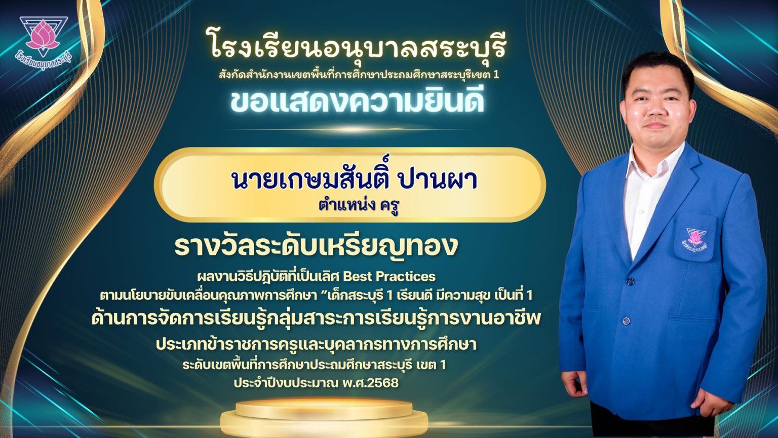 โรงเรียนอนุบาลสระบุรี ขอแสดงความยินดีกับ คุณครูเกษมสันติ์ ปานผา ได้รับรางวัลระดับเหรียญทอง การคัดเลือกผลงานวิธีปฎิบัติที่เป็นเลิศ Best Practice ด้านการจัดการเรียนรู้กลุ่มสาระการเรียนรู้การงานอาชีพ(ระดับประถมศึกษา) ประเภทข้าราชการครูและบุคลากรทางการศึกษา ระดับเขตพื้นที่การศึกษาประถมศึกษาสระบุรี เขต 1 ประจำปีงบประมาณ พ.ศ.2568 Share This :