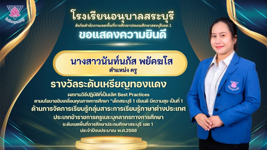 โรงเรียนอนุบาลสระบุรี ขอแสดงความยินดีกับ คุณครูนันท์นภัส พยัคฆโสด ได้รับรางวัลระดับเหรียญทองแดง การคัดเลือกผลงานวิธีปฎิบัติที่เป็นเลิศ Best Practice ด้านการจัดการเรียนรู้กลุ่มสาระการเรียนรู้ภาษาต่างประเทศ (ระดับประถมศึกษา) ประเภทข้าราชการครูและบุคลากรทางการศึกษา ระดับเขตพื้นที่การศึกษาประถมศึกษาสระบุรี เขต 1 ประจำปีงบประมาณ พ.ศ.2568 Share This :