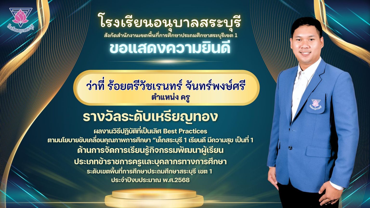 โรงเรียนอนุบาลสระบุรี ขอแสดงความยินดีกับ คุณครูวัชเรนทร์ จันทร์พงษ์ศรี ได้รับรางวัลระดับเหรียญทอง การคัดเลือกผลงานวิธีปฎิบัติที่เป็นเลิศ Best Practice ด้านการจัดการเรียนรู้กิจกรรมพัฒนาผู้เรียน (ระดับประถมศึกษา) ประเภทข้าราชการครูและบุคลากรทางการศึกษา ระดับเขตพื้นที่การศึกษาประถมศึกษาสระบุรี เขต 1 ประจำปีงบประมาณ พ.ศ.2568 Share This :