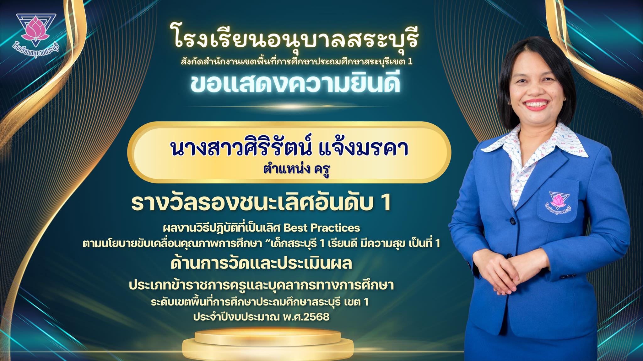 ขอแสดงความยินดีกับคุณครูศิริรัตน์ แจ้งมรคา ได้รับรางวัลรองชนะเลิศอันดับ 1 การคัดเลือกผลงานวิธีปฎิบัติที่เป็นเลิศ Best Practice ด้านการวัดและประเมินผล (ระดับประถมศึกษา) ประเภทข้าราชการครูและบุคลากรทางการศึกษา ระดับเขตพื้นที่การศึกษาประถมศึกษาสระบุรี เขต 1 ประจำปีงบประมาณ พ.ศ.2568