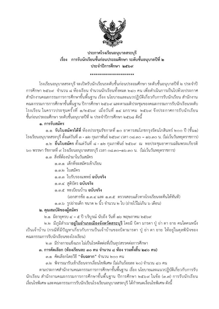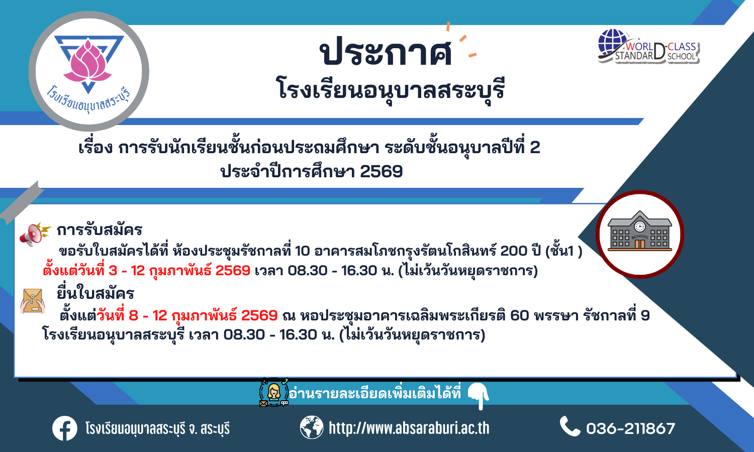 ประกาศโรงเรียนอนุบาลสระบุรี เรื่อง การรับนักเรียนชั้นก่อนประถมศึกษา ระดับชั้นอนุบาลปีที่ ๒ ห้องเรียนพิเศษด้านวิทยาศาสตร์และคณิตศาสตร์ ประจำปีการศึกษา ๒๕๖๙ ประกาศของโรงเรียน 15 มกราคม 2026By admin