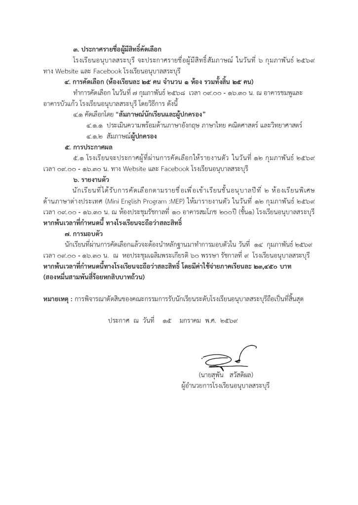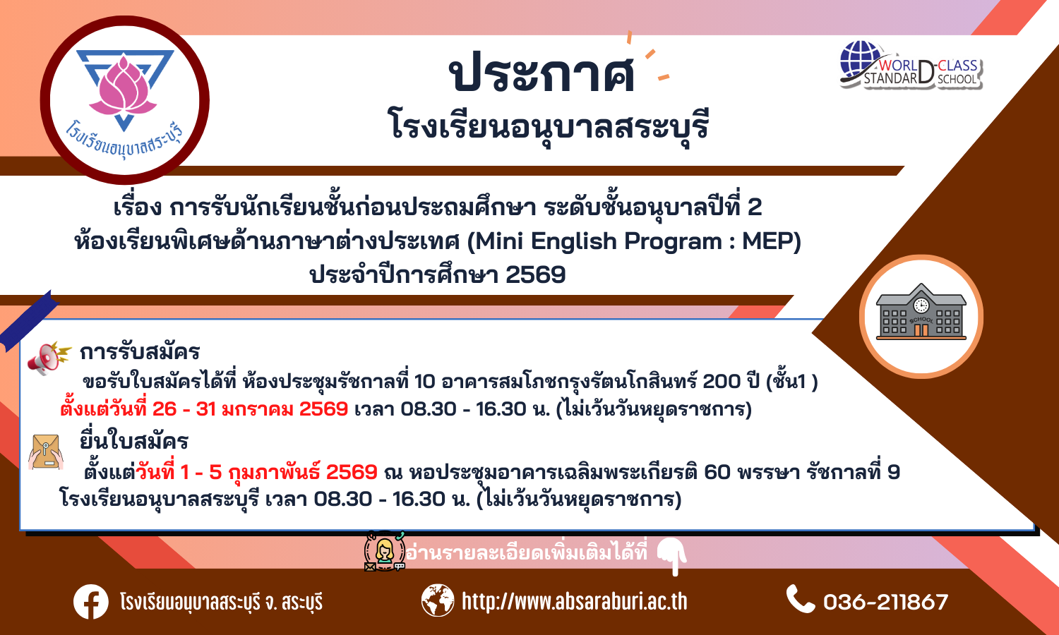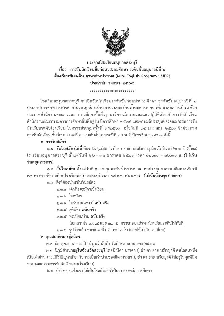 ประกาศโรงเรียนอนุบาลสระบุรี เรื่อง การรับนักเรียนชั้นก่อนประถมศึกษา ระดับชั้นอนุบาลปีที่ ๒ ห้องเรียนพิเศษด้านภาษาต่างประเทศ (Mini English Program : MEP) ประจำปีการศึกษา ๒๕๖๙