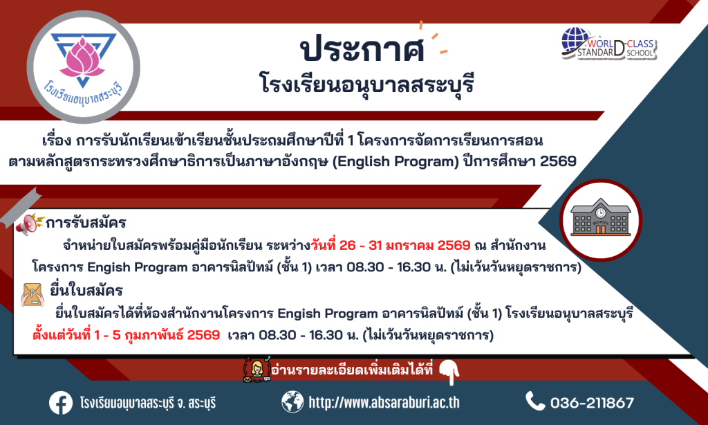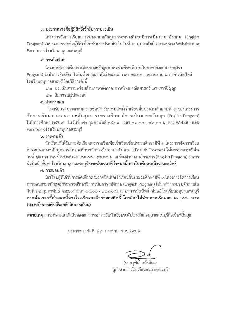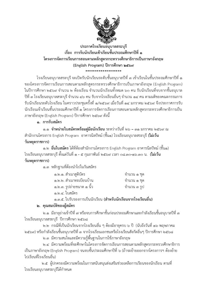 ประกาศโรงเรียนอนุบาลสระบุรี เรื่อง การรับนักเรียนเข้าเรียน ชั้นประถมศึกษาปีที่ ๑ โครงการจัดการเรียนการสอนตามหลักสูตรกระทรวงศึกษาธิการเป็นภาษาอังกฤษ (English Program) ปีการศึกษา ๒๕๖๙