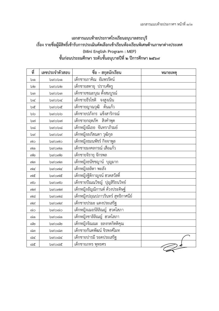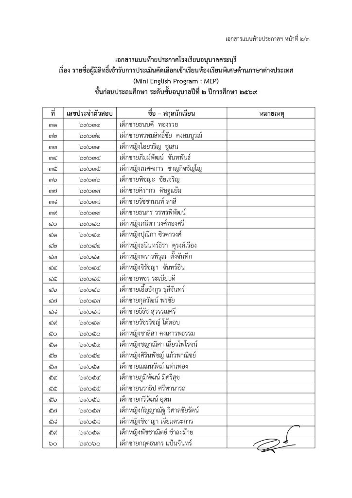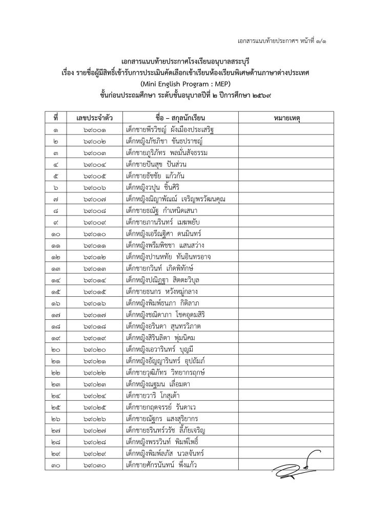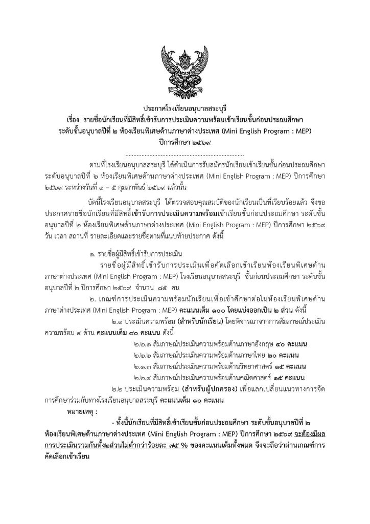 ประกาศโรงเรียนอนุบาลสระบุรี เรื่อง รายชื่อนักเรียนที่มีสิทธิ์เข้ารับการประเมินความพร้อมเข้าเรียนชั้นก่อนประถมศึกษา ระดับชั้นอนุบาลปีที่ ๒ ห้องเรียนพิเศษด้านภาษาต่างประเทศ (Mini English Program : MEP) ปีการศึกษา ๒๕๖๙