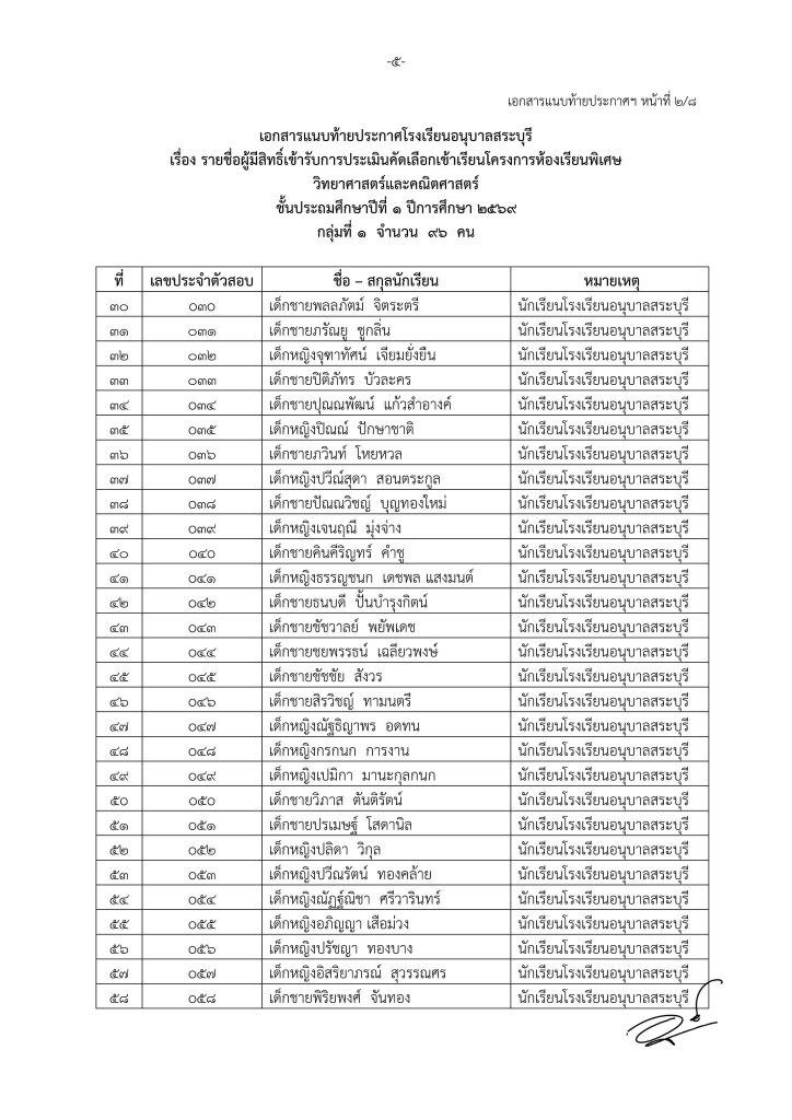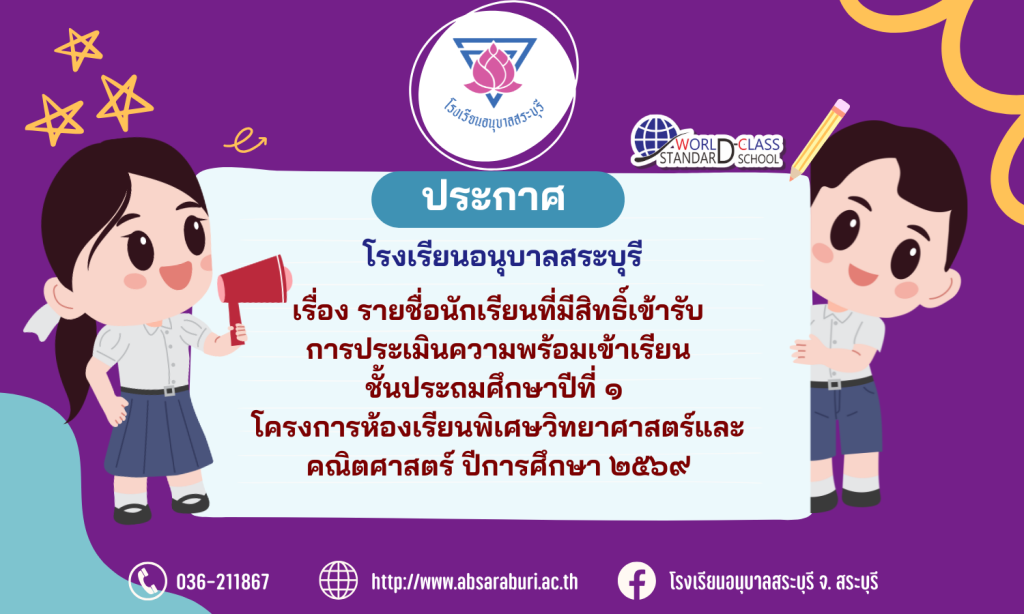 ประกาศโรงเรียนอนุบาลสระบุรี เรื่อง รายชื่อนักเรียนที่มีสิทธิ์เข้ารับการประเมินความพร้อมเข้าเรียนชั้นประถมศึกษาปีที่ ๑ โครงการห้องเรียนพิเศษวิทยาศาสตร์และคณิตศาสตร์ ปีการศึกษา ๒๕๖๙ Share This :