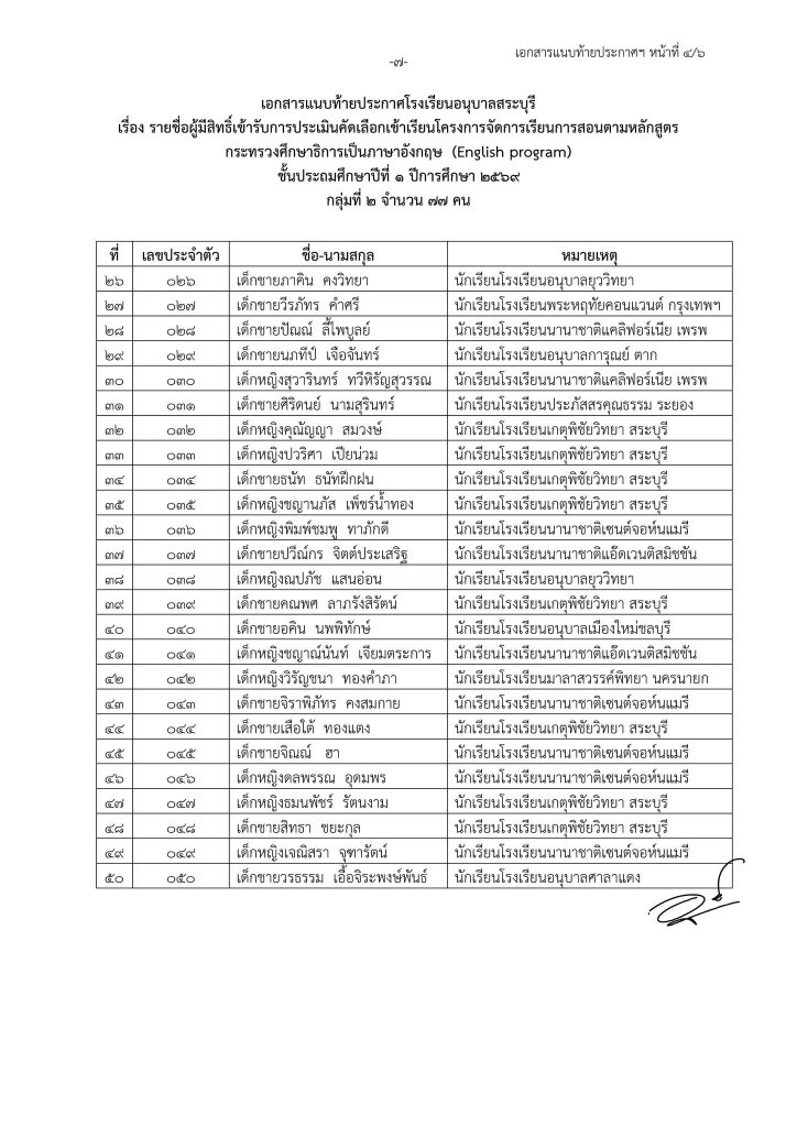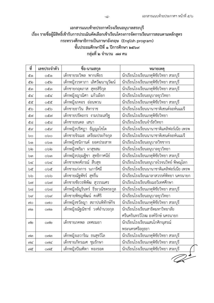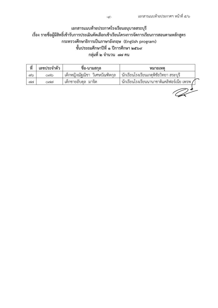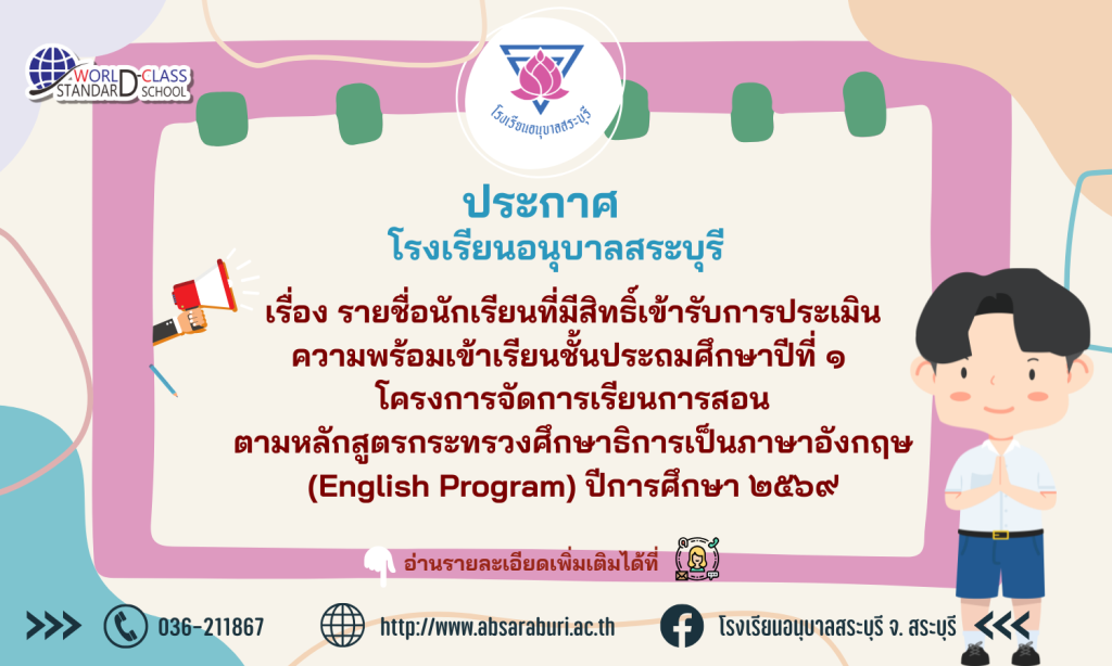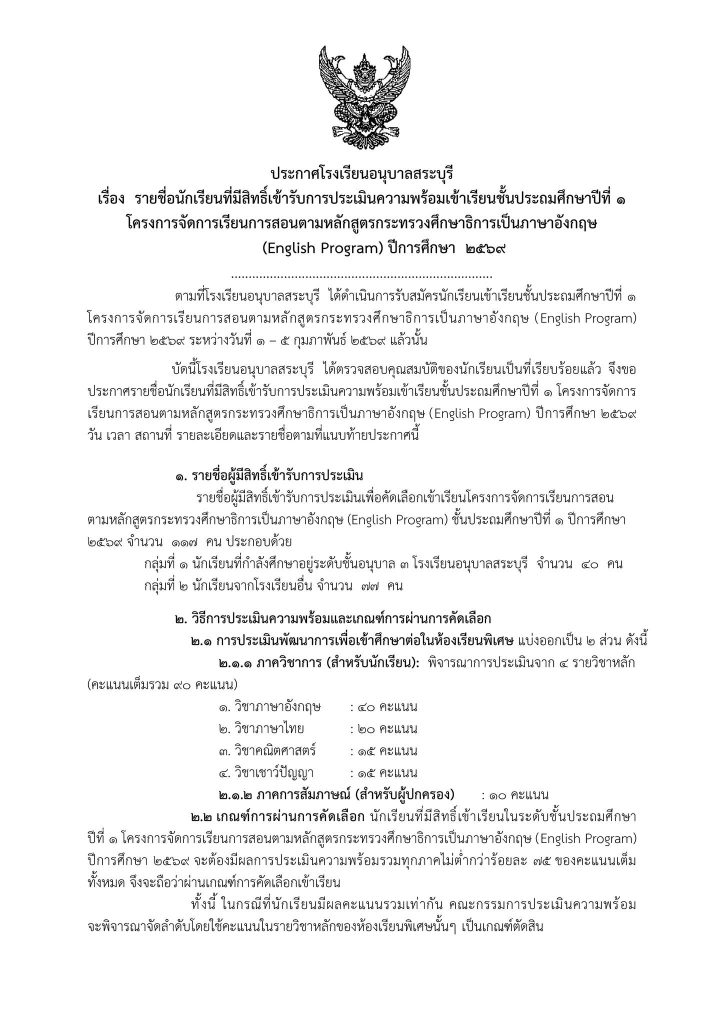 ประกาศโรงเรียนอนุบาลสระบุรี เรื่อง รายชื่อนักเรียนที่มีสิทธิ์เข้ารับการประเมินความพร้อมเข้าเรียนชั้นประถมศึกษาปีที่ ๑ โครงการจัดการเรียนการสอนตามหลักสูตรกระทรวงศึกษาธิการเป็นภาษาอังกฤษ (English Program) ปีการศึกษา ๒๕๖๙ Share This :