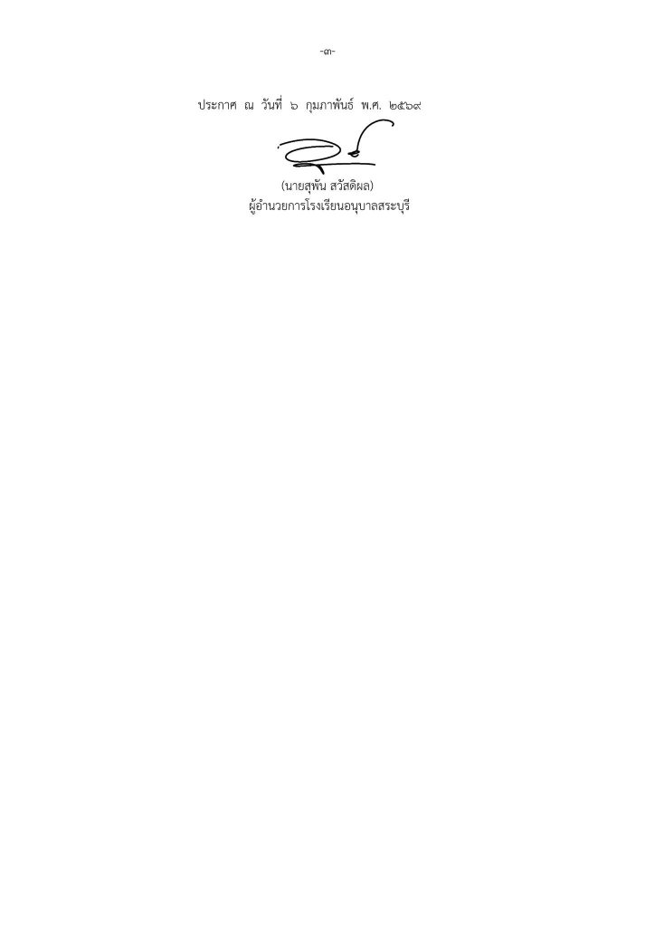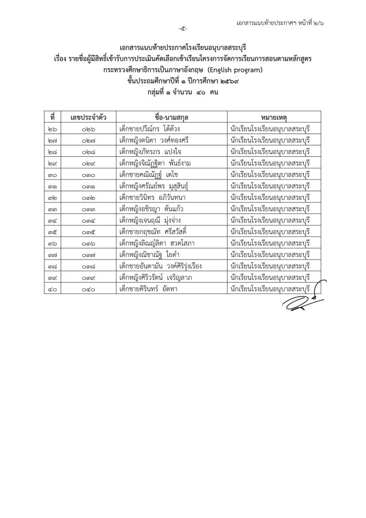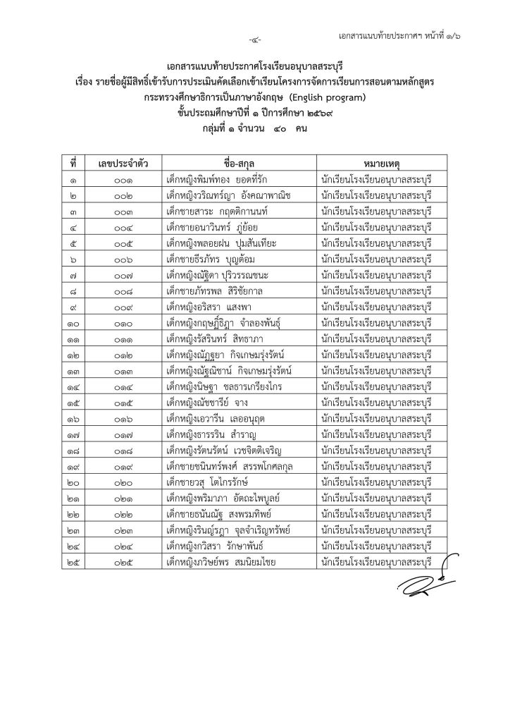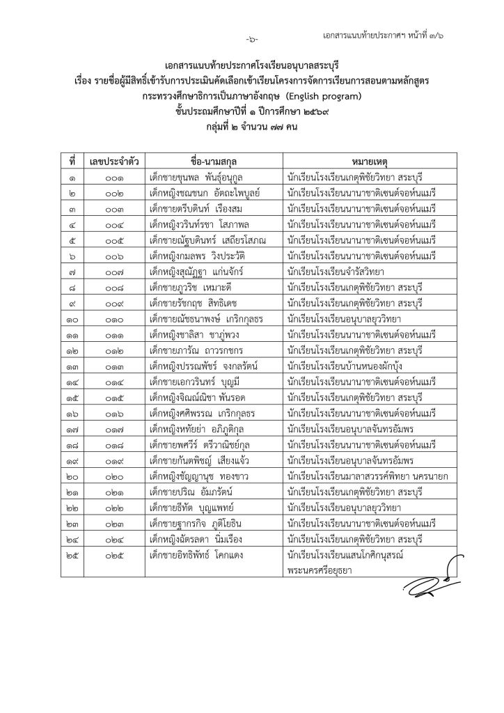ประกาศโรงเรียนอนุบาลสระบุรี เรื่อง รายชื่อนักเรียนที่มีสิทธิ์เข้ารับการประเมินความพร้อมเข้าเรียนชั้นประถมศึกษาปีที่ ๑ โครงการจัดการเรียนการสอนตามหลักสูตรกระทรวงศึกษาธิการเป็นภาษาอังกฤษ (English Program) ปีการศึกษา ๒๕๖๙ Share This :