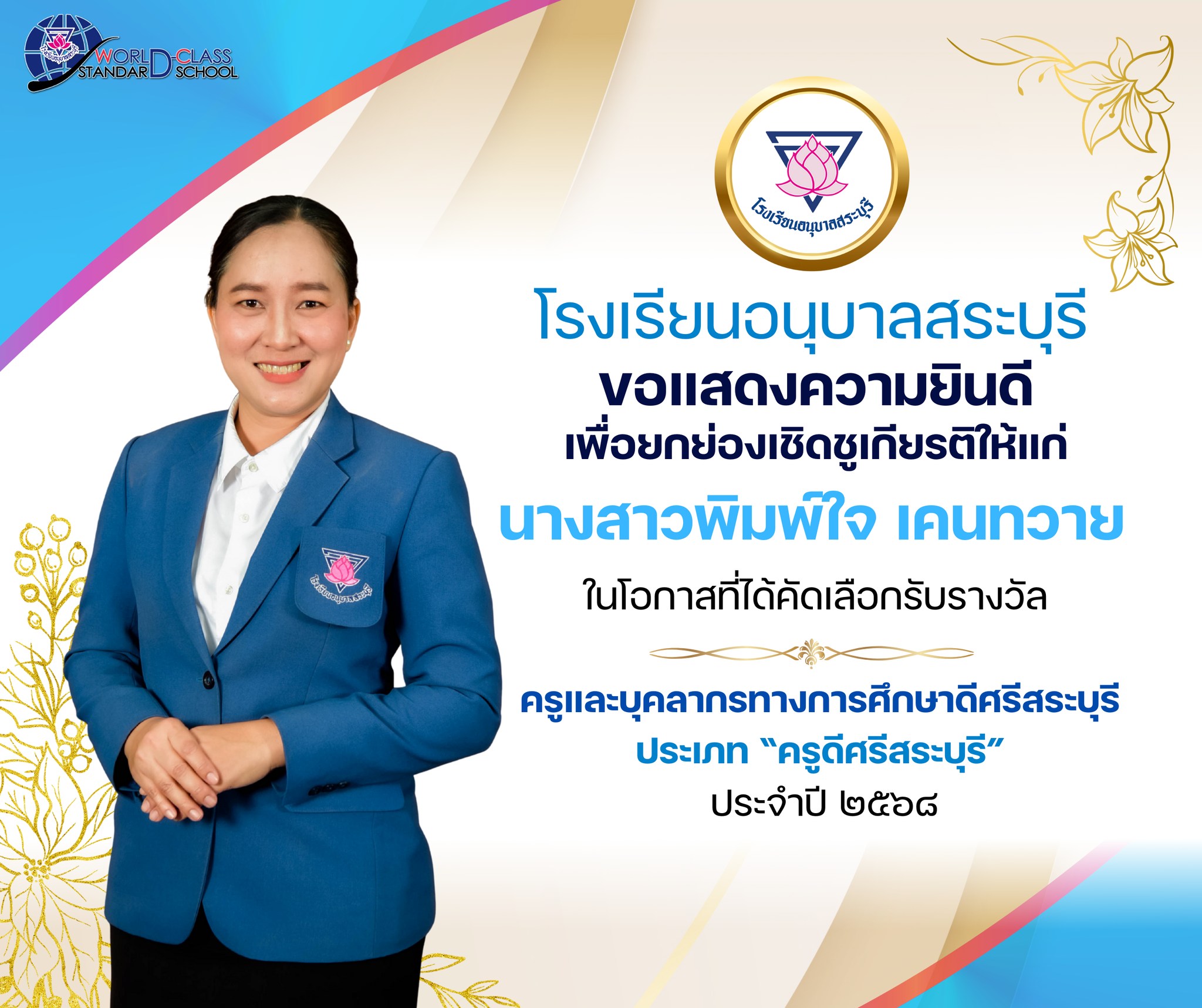 Home » Blog » รงเรียนอนุบาลสระบุรีขอแสดงความยินดี เพื่อยกย่องเชิดชูเกียรติให้แก่ นางสาวพิมพ์ใจ เคนทวาย ในโอกาสที่ได้คัดเลือกรับรางวัล ครูและบุคลากรทางการศึกษาดีศรีสระบุรี ประเภท “ครูดีศรีสระบุรี” ประจำปี ๒๕๖๘