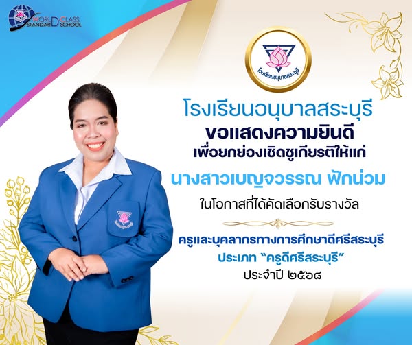 โรงเรียนอนุบาลสระบุรีขอแสดงความยินดี เพื่อยกย่องเชิดชูเกียรติให้แก่ นางสุนันทา ไม้จีน ในโอกาสที่ได้คัดเลือกรับรางวัล ครูและบุคลากรทางการศึกษาดีศรีสระบุรี ประเภท “ครูดีศรีสระบุรี” ประจำปี ๒๕๖๘ ผลงานครูของเรา 24 ธันวาคม 2025By admin