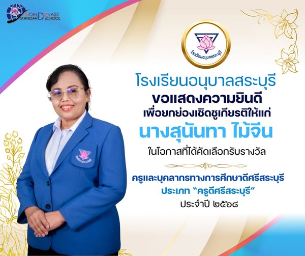 โรงเรียนอนุบาลสระบุรีขอแสดงความยินดี เพื่อยกย่องเชิดชูเกียรติให้แก่ นางสุนันทา ไม้จีน ในโอกาสที่ได้คัดเลือกรับรางวัล ครูและบุคลากรทางการศึกษาดีศรีสระบุรี ประเภท “ครูดีศรีสระบุรี” ประจำปี ๒๕๖๘