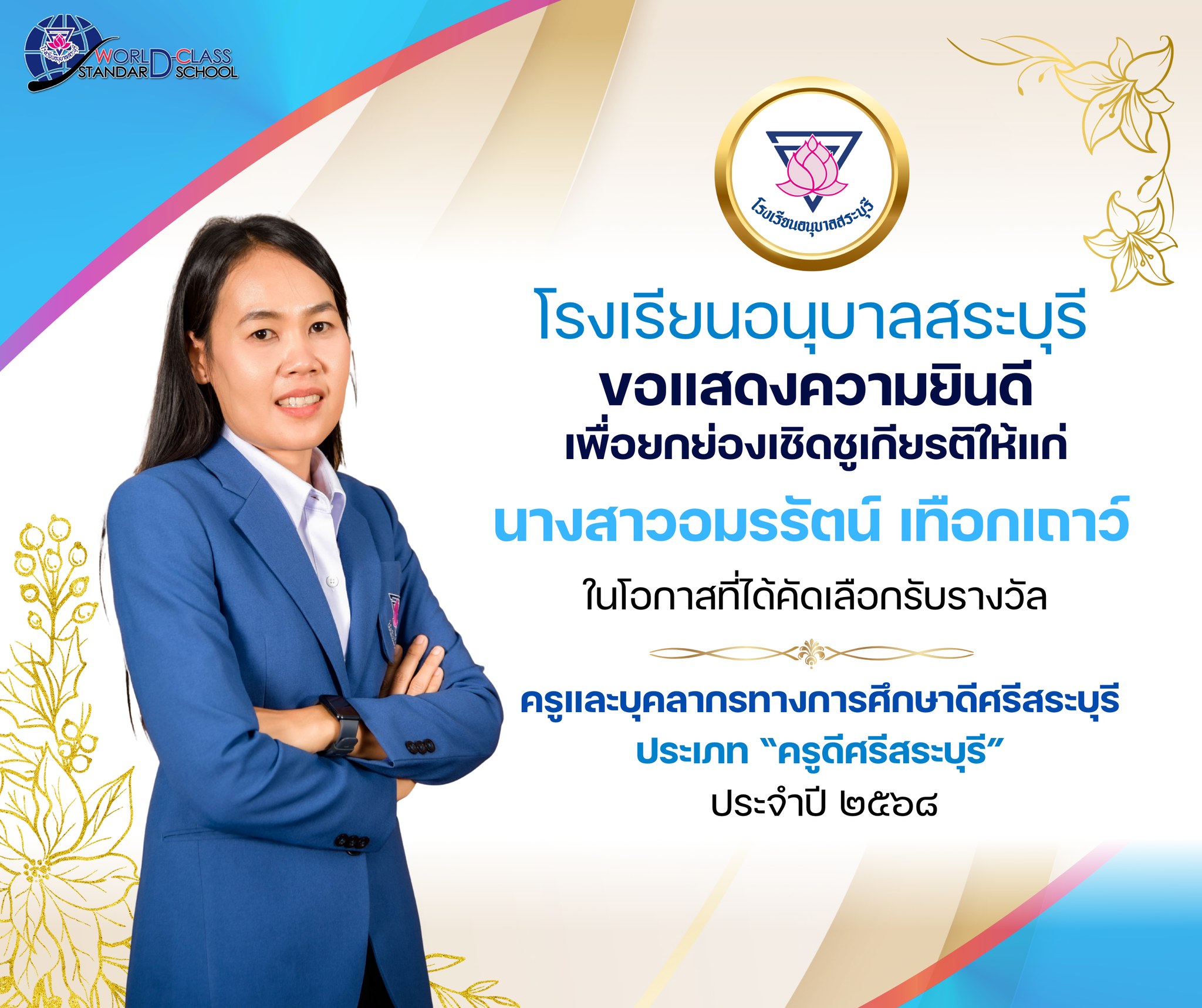 โรงเรียนอนุบาลสระบุรีขอแสดงความยินดี เพื่อยกย่องเชิดชูเกียรติให้แก่ นางสาวอมรรัตน์ เทือกเถาว์ ในโอกาสที่ได้คัดเลือกรับรางวัล ครูและบุคลากรทางการศึกษาดีศรีสระบุรี ประเภท “ครูดีศรีสระบุรี” ประจำปี ๒๕๖๘