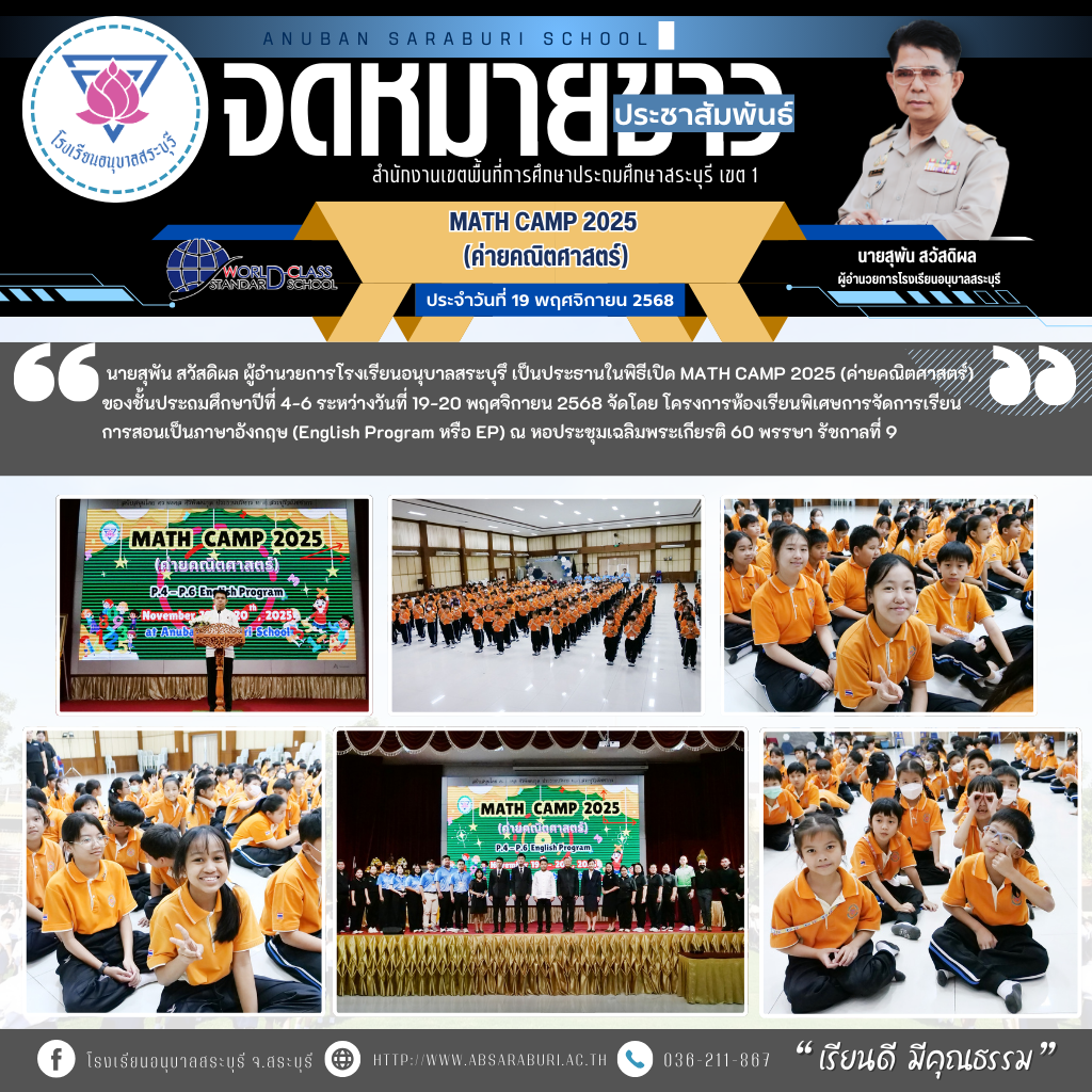 วันที่ 19 พฤศจิกายน 2568 นายสุพัน สวัสดิผล ผู้อำนวยการโรงเรียนอนุบาลสระบุรึ เป็นประธานในพิธีเปิด MATH CAMP 2025 (ค่ายคณิตศาสตร์) ของชั้นประถมศึกษาปีที่ 4-6 ระหว่างวันที่ 19-20 พฤศจิกายน 2568 จัดโดย โครงการห้องเรียนพิเศษการจัดการเรียนการสอนเป็นภาษาอังกฤษ (English Program หรือ EP) ณ หอประชุมเฉลิมพระเกียรติ 60 พรรษา รัชกาลที่ 9