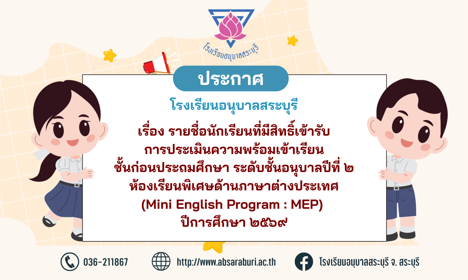 ขอแสดงความยินดีกับ “โรงเรียนอนุบาลสระบุรี” ที่ได้รับรองมาตรฐานการจัดการศึกษาจากการประกันคุณภาพภายนอก รอบที่ ๕ (พ.ศ.๒๕๖๘-๒๕๗๒) การศึกษาปฐมวัยและระดับการศึกษาขั้นพื้นฐาน) จากสำนักงานรับรองมาตรฐานและประเมินคุณภาพการศึกษา (องค์การมหาชน) สมศ.